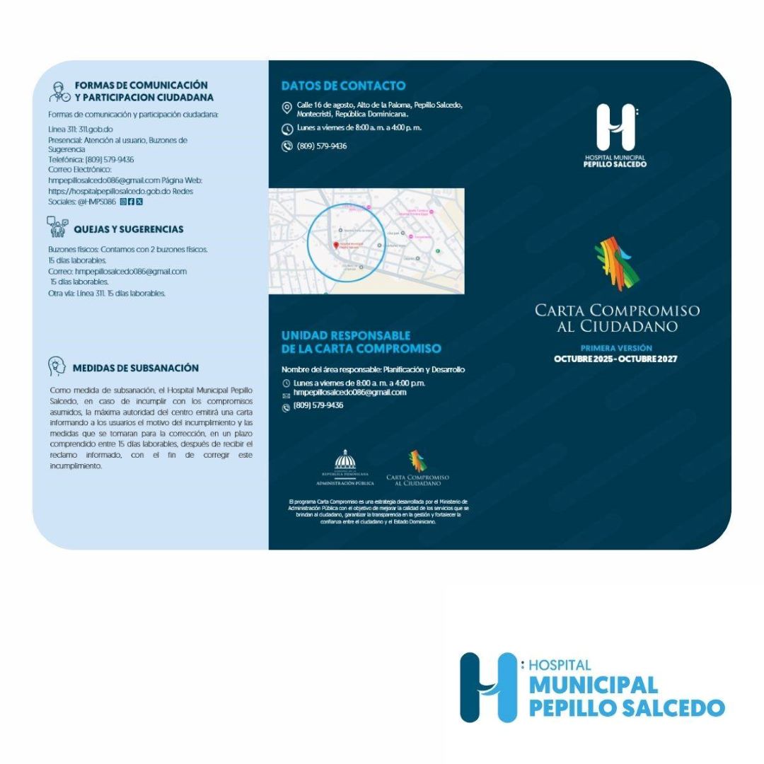 Pepillo Salcedo, Montecristi. El Hospital Municipal Pepillo Salcedo presenta formalmente la Primera Versión de su Carta Compromiso al Ciudadano 2025–2027, un documento que refleja nuestra dedicación a ofrecer servicios de salud con calidad, respeto y transparencia. A través de esta carta garantizamos: ✔Atención humanizada y profesional. ✔Acceso oportuno a nuestros servicios. ✔Mecanismos claros para quejas, … Leer más